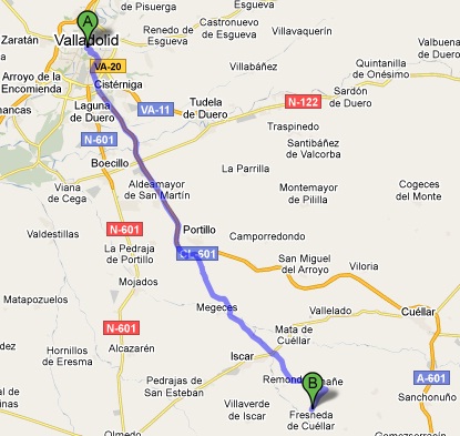 b)Salimos de Valladolid por la carretera N 601 hacia Madrid. Se sigue la carretera hasta Mojados donde nos desviamos hacia Megeces (VP-1102).Una vez se cruza Megeces se sigue en dirección Íscar continuando por la misma carretera hasta el cruce hacia Chañe y desde allí a Fresneda por las carreteras que se han indicado en la ruta anterior.