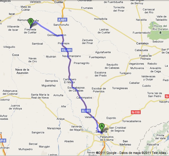 a) Siguiendo la A 601 hasta Gomezserracín (63Km) y desde allí por una carretera local SG-333 dirección a Chañe pasando por Campo de Cuéllar y Chañe. Desde alli coger carretera SG-V-3341 dirección Fresneda de Cuellar (2 Km).